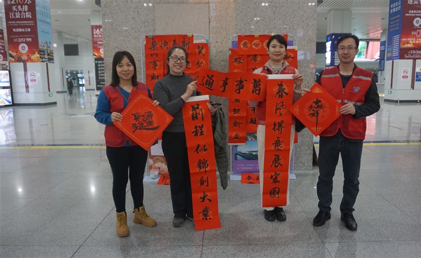 活動(dòng)現(xiàn)場(chǎng),一幅幅提前寫好的春聯(lián)福字整齊排列,散發(fā)著陣陣墨香,傳遞著濃濃的節(jié)日氛圍。黨員志愿者們?cè)谌巳褐?/span>忙碌穿梭,熱情地將飽含新春祝福的春聯(lián)與寓意滿滿的福字到過往旅客、車站工作人員和出租車司機(jī)手中。一位拖著行李的旅客接過春聯(lián)感動(dòng)地說“這大紅的春聯(lián)和福字,一下子就讓回家的路充滿了年味!”車站工作人員和司機(jī)們也紛紛表示,這份禮物十分貼心,讓他們心里暖洋洋的。